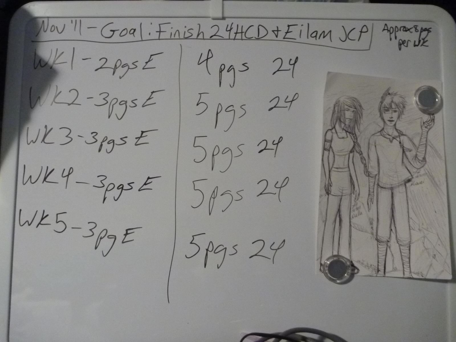 This was my first attempt at keeping a schedule. I had the ambitious idea that I could finish that many pages a week. Needless to say, I failed. A pen sketch of Niella and Kuwei to help keep me inspired even though I wasn’t working on their story at the time….XD Screwed up their anatomy a little…