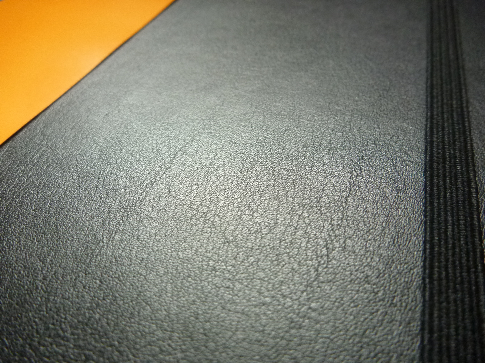 This is a nice cover, very much like the Moleskine. I prefer the inconspicuous black versus the bright orange, just my opinion but the orange is nice too. The cover is what I describe as a semi-hard cover. It bends slightly but it’s stiff enough to not need a hard surface to write upon if needed.